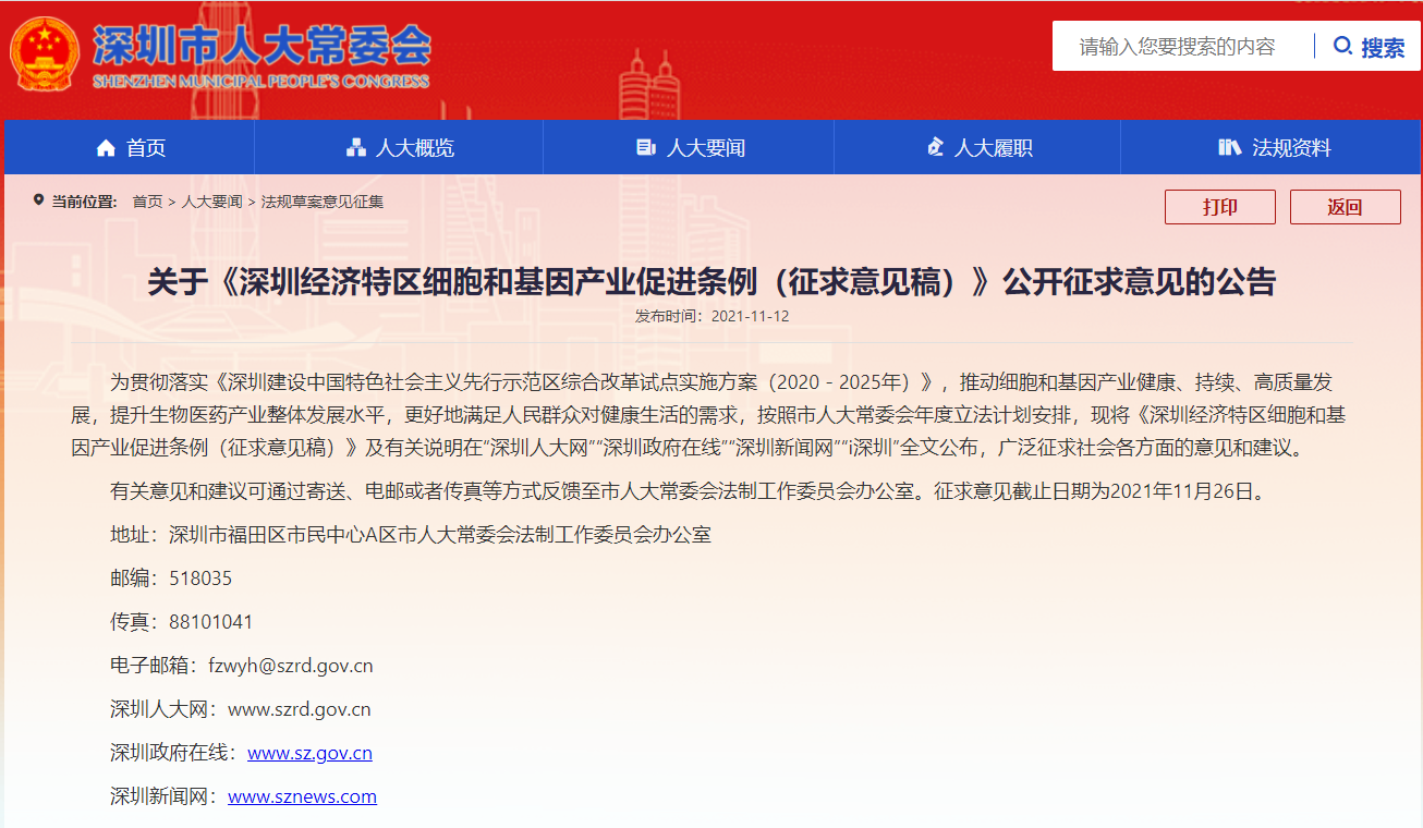 2021年11月12日,深圳新興領(lǐng)域重要立法《深圳經(jīng)濟(jì)特區(qū)細(xì)胞和基因產(chǎn)業(yè)促進(jìn)條例(征求意見稿)》在深圳市人大常委會(huì)網(wǎng)站上公開征求意見。為貫徹落實(shí)《深圳建設(shè)中國特色社會(huì)主義先行示范區(qū)綜合改革試點(diǎn)實(shí)施方案